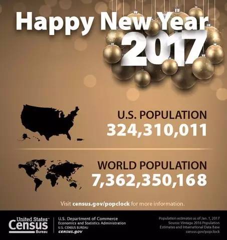 美國人口調(diào)查局給出的預(yù)測顯示,到2017年1月1日,全球人口將達到7,362,350,168人,較去年同期增長1.07%。美國的人口總數(shù)為324,310,011,較去年同期增長0.7%。2017年1月,全球平均每秒將有4.3人出生,1.8人死亡。(美通社,2016年12月28日華盛頓)