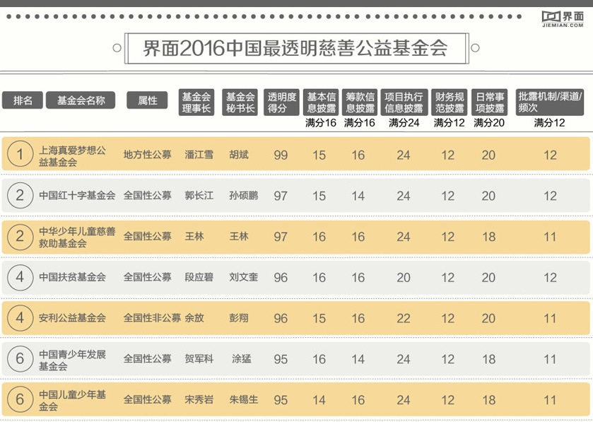 界面發(fā)布了其第一份基金會榜單——“2016中國最透明慈善公益基金會排行榜”。該榜單共有50家基金會入選,上海真愛夢想公益基金會作為地方性公募基金會,今年名列榜首,中國紅十字基金會和中華少年兒童慈善救助基金會并列第二。50家基金會的2015年捐款收入總額為90.1億元,較其2014年的捐款收入總額73.5億元增長了21.6%。(美通社,2017年1月6日北京)