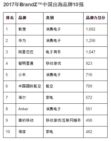 WPP和凱度華通明略聯(lián)手Google發(fā)布了首期“BrandZ中國出海品牌30強”排行榜及報告。聯(lián)想以1,682的品牌力得分一馬當(dāng)先,成為最強大的中國出海品牌。緊隨其后的是,華為(1,256)以及阿里巴巴(1,047)。報告指出,消費者對中國產(chǎn)品的負面認知正在下降,互聯(lián)網(wǎng)驅(qū)動品牌潛力巨大,中國品牌行動速度往往快于西方品牌。(美通社,2017年1月10日北京)