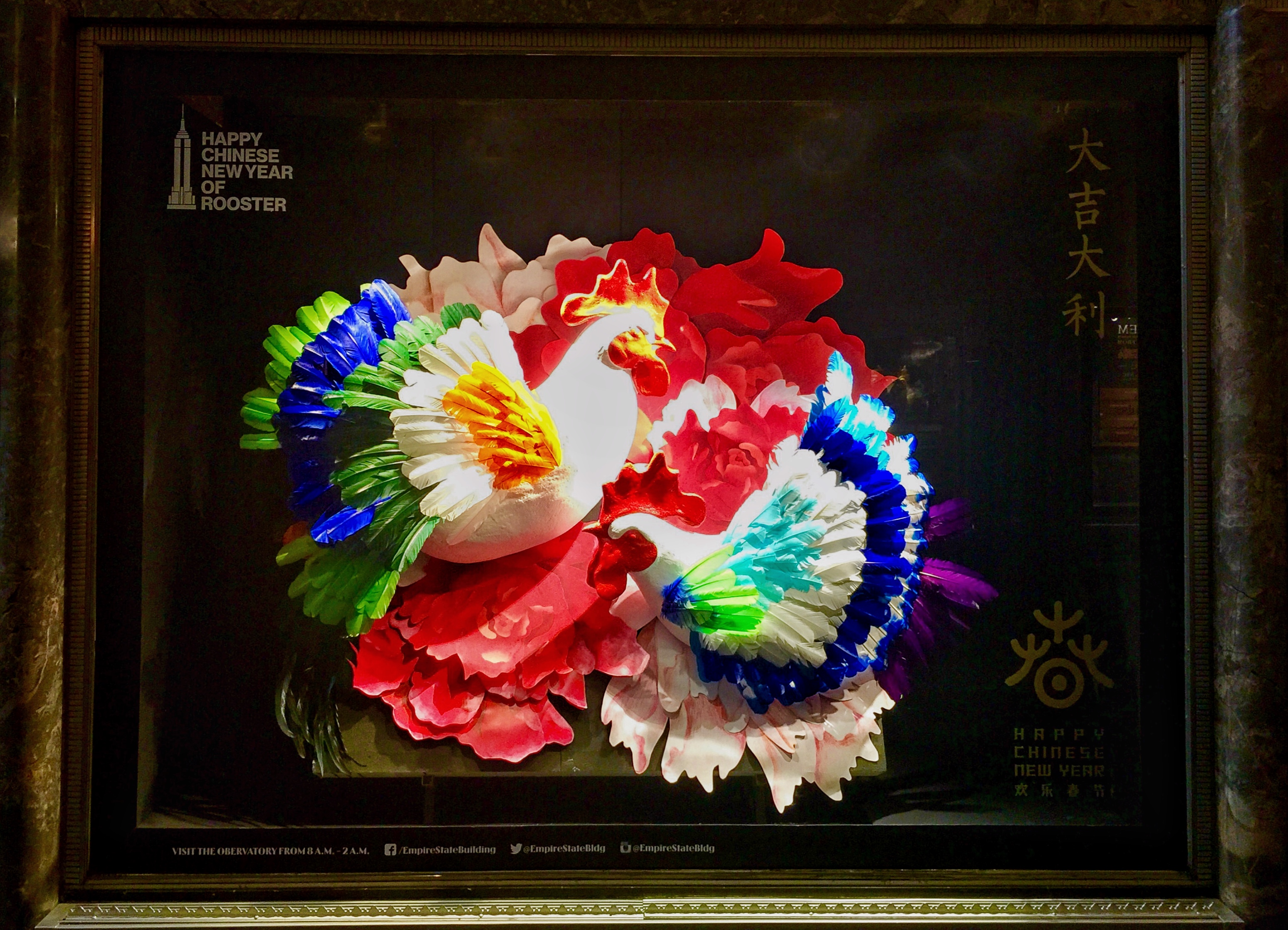 為慶祝雞年春節(jié)的到來,帝國大廈將專為中國農(nóng)歷新年亮燈并進行新年倒數(shù),并推出一年一度的春節(jié)櫥窗展,分別以“金雞報曉”、“大吉大利”、“金雞納福”為主題,為觀眾呈獻融合當代特色的立體中國年畫。2017年1月26日至27日,專為中國農(nóng)歷新年打造,由中央美術(shù)學院設(shè)計的“普天同慶”新春燈光秀將于帝國大廈舉世聞名的塔頂特別呈現(xiàn)。(美通社,2017年1月24日紐約)