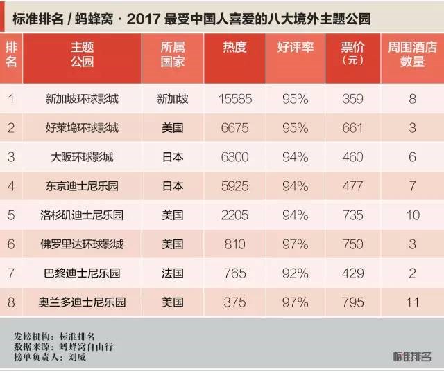 螞蜂窩近日聯(lián)合標(biāo)準(zhǔn)排名發(fā)布了“2017最受中國人喜愛的八大境外主題公園”排行榜,以境外主題公園的熱度、好評率、票價、周邊酒店數(shù)量等四項指標(biāo)進(jìn)行衡量。榜單顯示,2017最受中國人喜愛的八大境外主題公園是新加坡環(huán)球影城、好萊塢環(huán)球影城、大阪環(huán)球影城、東京迪士尼樂園、洛杉磯迪士尼樂園、佛羅里達(dá)環(huán)球影城、巴黎迪士尼樂園和奧蘭多迪士尼樂園。